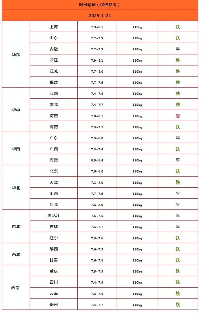 最新监测显示,1月21日外三元标猪均价已降至15.49元/公斤左右,南北市场猪价普遍下跌。预计未来1–2日,猪价或继续维持震荡偏弱走势。后续需密切关注冷空气及雨雪天气对生猪调运和市场购销的影响。