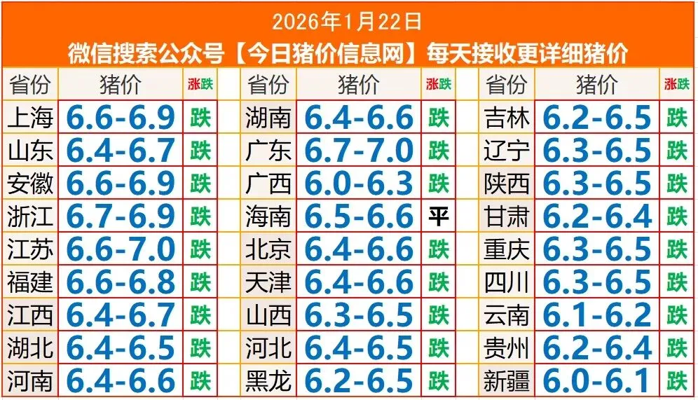 今日猪价| 2026.1.22.明天猪价(只供参考) 养羊网 2026-01-21 今日猪价| 2026.1.22.明天猪价(只供参考) 养羊网 2026-01-21 上一篇:1月21日 今日猪价 下一篇:01月21日宜春褐壳鸡蛋价格 您可能还会对下面的文章感兴趣111: 相关文章 我家的黄牛 一板鸡蛋30个,才18块9,一杯奶茶钱而已 近期价格更新!!! 关税作妖,美国鸡蛋价格再涨