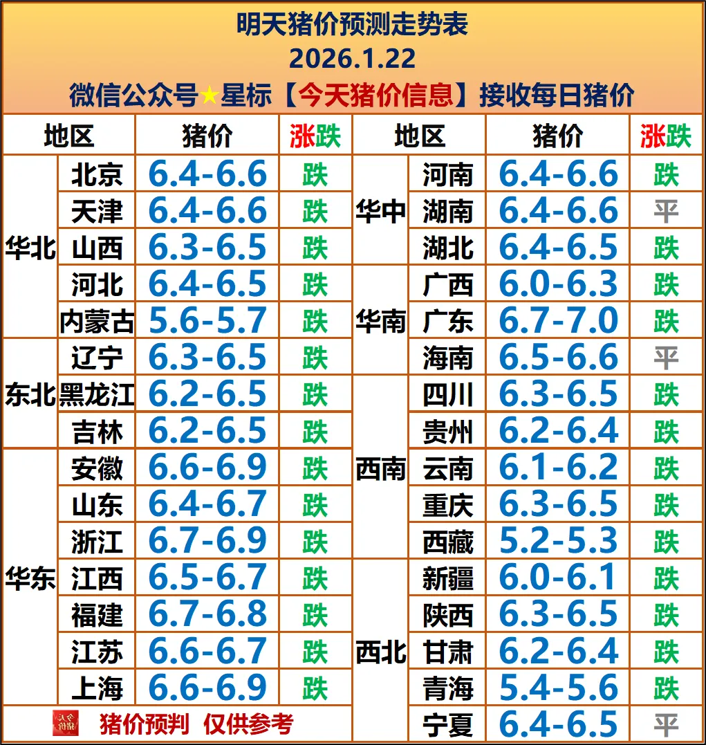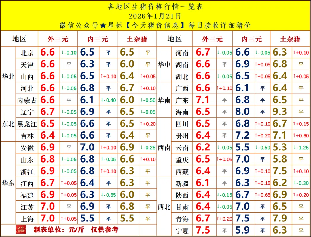 今日猪价 | 2026.1.22 明天猪价走势分析!2026年01月21日猪价行情:全国综合均价6.61元/斤 外三元:6.60元/斤,较昨日下跌0.02元 内三元:6.71元/斤,较昨日上涨0.02元 土杂猪:6.51元/斤,较昨日上涨0.03元
