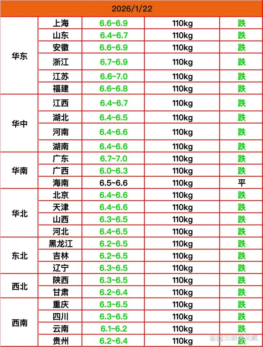 下跌的地区:同时在连续涨价那么长时间之后,屠宰企业也一直在等待压价机会,这回恰逢出栏增多,压价的力度也是不小,今天上海、山东等25个地区继续下跌;