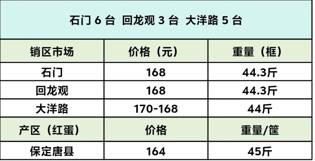 大洋路鸡蛋价格2026年 1 月 22 日报价 养羊网 2026-01-22 大洋路鸡蛋价格2026年 1 月 22 日报价大洋路到车 5 台,价格 170-168 元,没有剩车,明天回车预计 4 台附近。 养羊网 2026-01-22 上一篇:2026.01.23-明天猪价 下一篇:元月22日各地鸡蛋价格(涨) 您可能还会对下面的文章感兴趣111: 相关文章 养肥猪=养肥钱包!招20人 2025年4月13日全国各地生猪价格信息 带着草原的呼唤,羊肉包装设计 武汉土鸡蛋一块钱一个不赚钱?