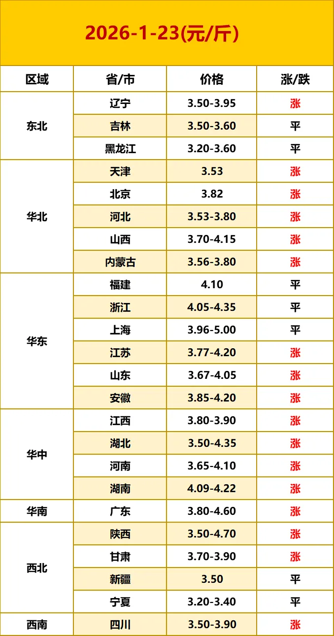 2026.1.23 今日鸡蛋价格 养羊网 2026-01-22 2026.1.23 今日鸡蛋价格蛋价日评:今日鸡蛋价格上涨。当前蛋鸡存栏偏高、货源供应充足,节前家庭采购增加带动走货略加快,北方寒潮短期支撑价格,预计短期蛋价整体高位维稳。以上报价仅供参考! 养羊网 2026-01-22 上一篇:2026-1- 23全国猪价预测 下一篇:今日鸡蛋价格行情(2026年1月22日) 您可能还会对下面的文章感兴趣111: 相关文章 近期价格更新!!! 啊这 我不是被骗了吧|打卡 滴~ 高黎贡山一日游也太欢乐了?? 2025年4月13日全国各地生猪价格信息