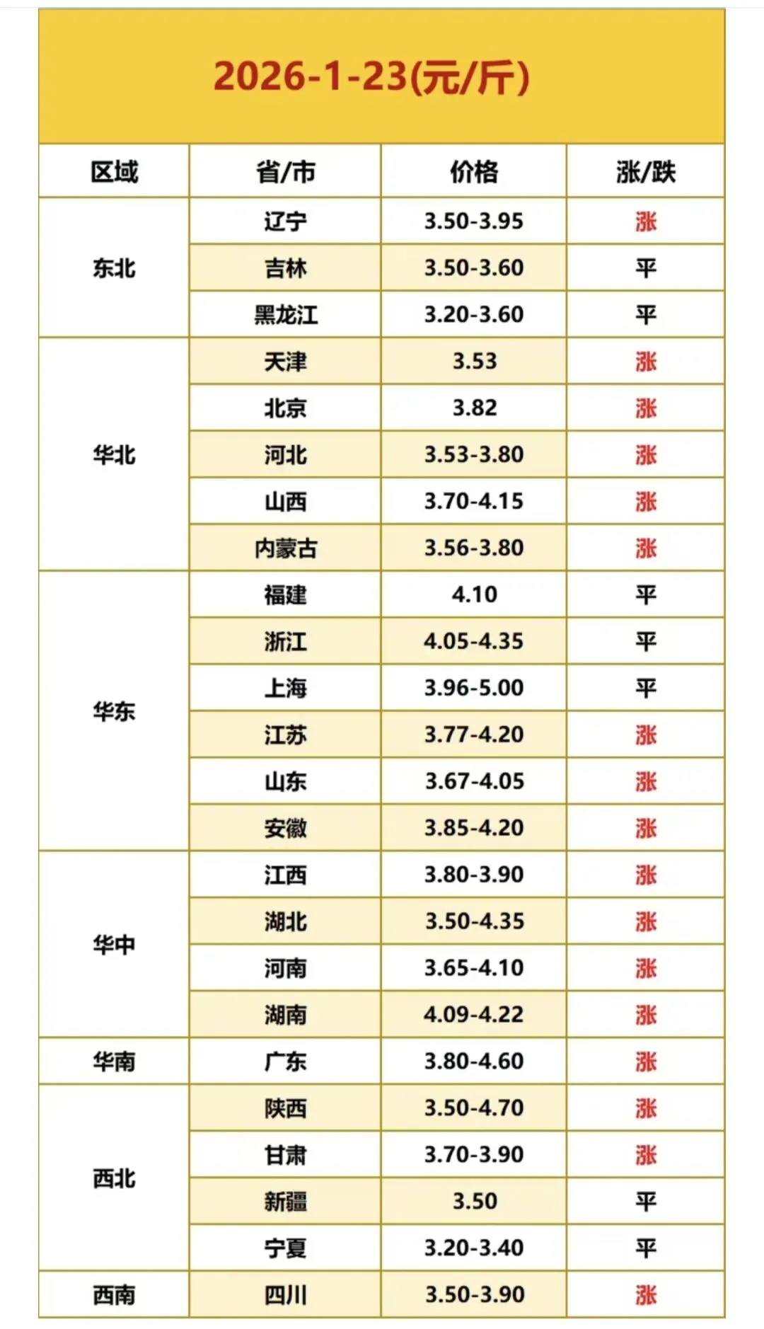 2026年1月23日全国鸡蛋价格最新走势 ? ? ? 全国鸡蛋最新价格参考: