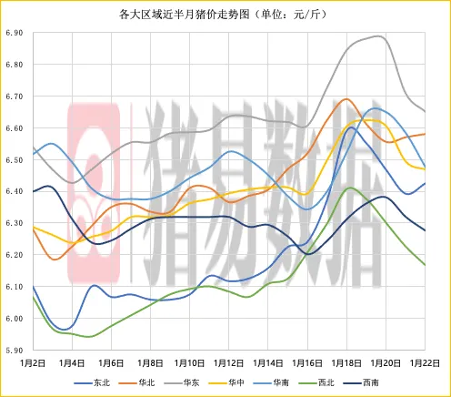 西北、华中、华东、华南、西南地区猪价呈现下跌,东北、华北地区猪价呈现上涨,生猪平均价格微幅下跌。