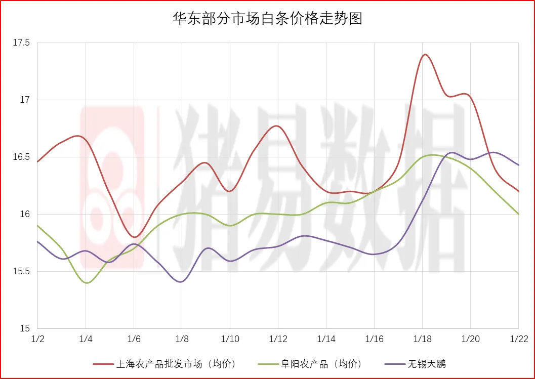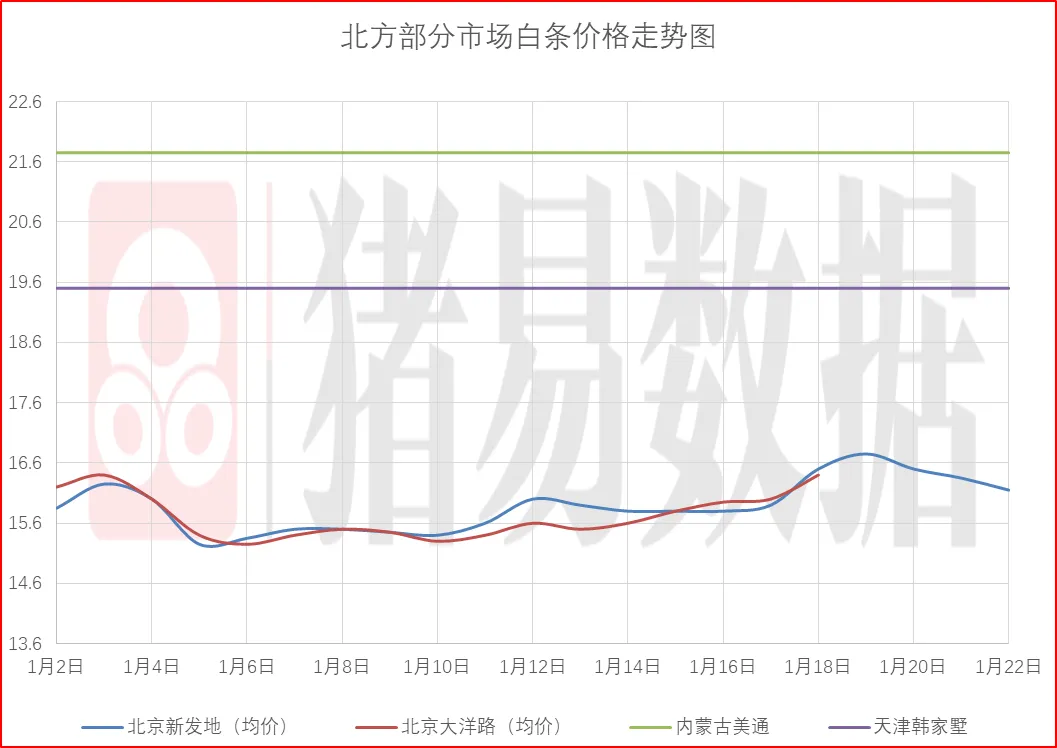 从今日北京、上海消费城市批发市场白条价格走势来看,北京、上海批发市场白条开磅价格呈现下跌态势,北京大部分市场开磅价格下跌0.2-0.4元/公斤,市场走货速度表现偏差;上海市场价格呈现下跌态势,部分市场成交价参考16.2-16.42元/公斤,到货量表现有所减少,市场交易情绪表现偏差,市场成交均价表现偏差。