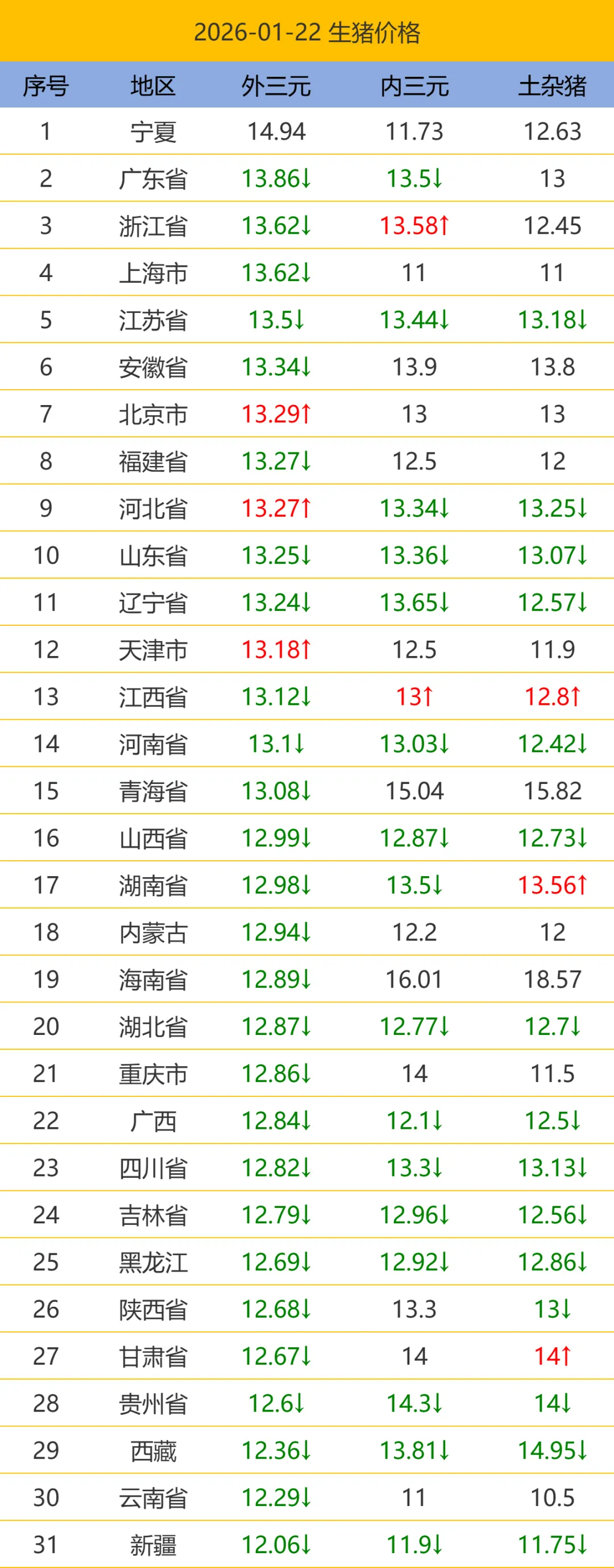 今日猪价.2026.01.22最新生猪价格/期货猪价 养羊网 2026-01-23 今日猪价.2026.01.22最新生猪价格/期货猪价以下猪价为平均价格(单位:元/公斤),仅供参考。 养羊网 2026-01-23 上一篇:【超前猪价】1月23-1月25日 猪价!全国猪价大预测 下一篇:【超前猪价大预测】1月24~1月26日!全国猪价 您可能还会对下面的文章感兴趣111: 相关文章 宁夏山羊 新疆伊犁今日牛羊肉价格 2025年4月13日全国各地生猪价格信息 2025年4月13日全国各地生猪价格信息