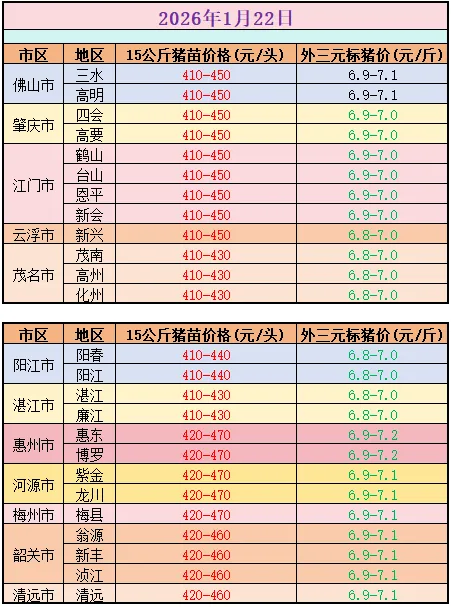 1月22日猪价速递 养羊网 2026-01-23 1月22日猪价速递广东猪苗全省各地涨价,报410~470元起,毛猪报6.8~7.2元,除佛山稳定外,其它地区价格微跌0.1~0.3元。年关行情已启动,节奏瞬息,踏准步伐。(行情仅供参考) 养羊网 2026-01-23 上一篇:【超前猪价大预测】1月24~1月26日!全国猪价 下一篇:全国猪价情况: 6涨6平14跌,上涨省市增加6个 您可能还会对下面的文章感兴趣111: 相关文章 2025年4月13日全国各地生猪价格信息 2025年4月13日全国各地生猪价格信息 deepseek帮我在西安找月薪过万的工作? 2025年4月13日全国各地生猪价格信息