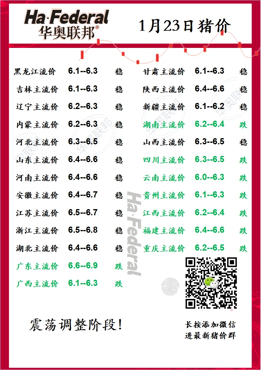 1月23最新猪价 风向变了? 养羊网 2026-01-23 1月23最新猪价 风向变了?进最新报价群 加微信 v联系电话:137 ?0084 ?5054 养羊网 2026-01-23 上一篇:2026.1.23-明天猪价(全国各地生猪报价) 下一篇:【超前猪价大预测】1月24日~1月27日全国猪价!?! 您可能还会对下面的文章感兴趣111: 相关文章 【东北猪价】 2026. 1. 7 多地上涨! 涨!涨!2026.1.14明日全国猪价早知道 近期价格更新!!! 生猪市场最新消息2025-05-20