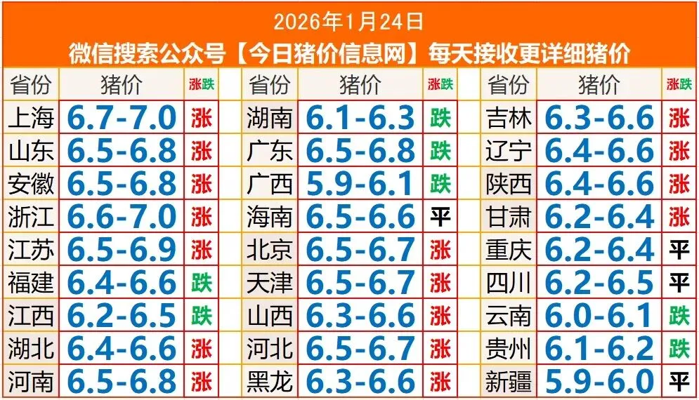 今日猪价| 2026.1.24.全国最新猪价信息(只供参考) 养羊网 2026-01-23 今日猪价| 2026.1.24.全国最新猪价信息(只供参考) 养羊网 2026-01-23 上一篇:2026-1-23全国鸡蛋价格早报 下一篇:2026年1月23日宁城鸡蛋价格早报 您可能还会对下面的文章感兴趣111: 相关文章 畜舍采光设计 近期价格更新!!! 胖永辉开来大学城啦!!快冲!!(附攻略) 近期价格更新!!!