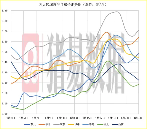 东北、西北、华北、华东地区猪价呈现上涨,华中、西南、华南地区猪价呈现下跌,生猪平均价格微涨。