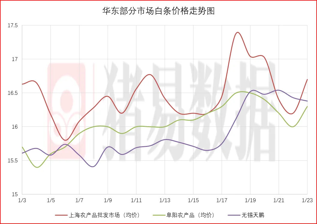 从今日北京、上海消费城市批发市场白条价格走势来看,北京、上海批发市场白条开磅价格呈现稳中伴涨,北京大部分市场开磅价格上涨0.2-0.4元/公斤,市场走货速度表现一般;上海市场价格呈现上涨态势,部分市场成交价参考16.7-16.92元/公斤,到货量表现有所减少,市场交易情绪表现一般,市场成交均价表现偏好。