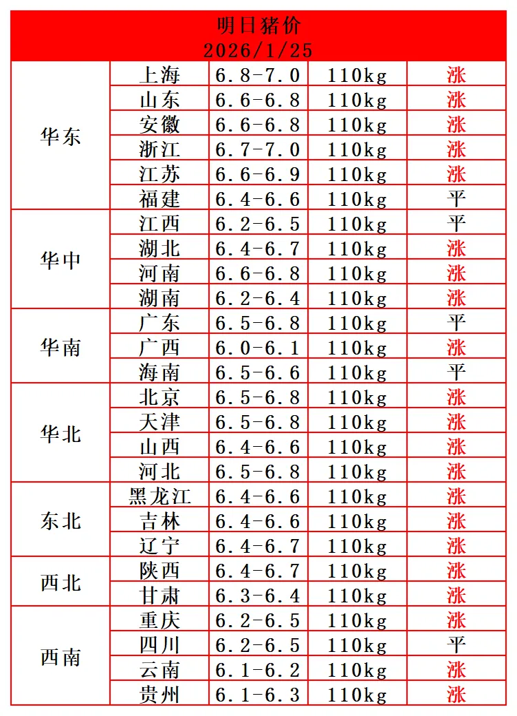 猪价满堂红!明日全国生猪行情! 养羊网 2026-01-24 猪价满堂红!明日全国生猪行情! 养羊网 2026-01-24 上一篇:1月24号 最新鸡蛋价格速查 下一篇:【鸡蛋价格】2026.1.25—最新鸡蛋价格 您可能还会对下面的文章感兴趣111: 相关文章 近期价格更新!!! 2025年4月13日全国各地生猪价格信息 近期价格更新!!! 赶羊过山麓