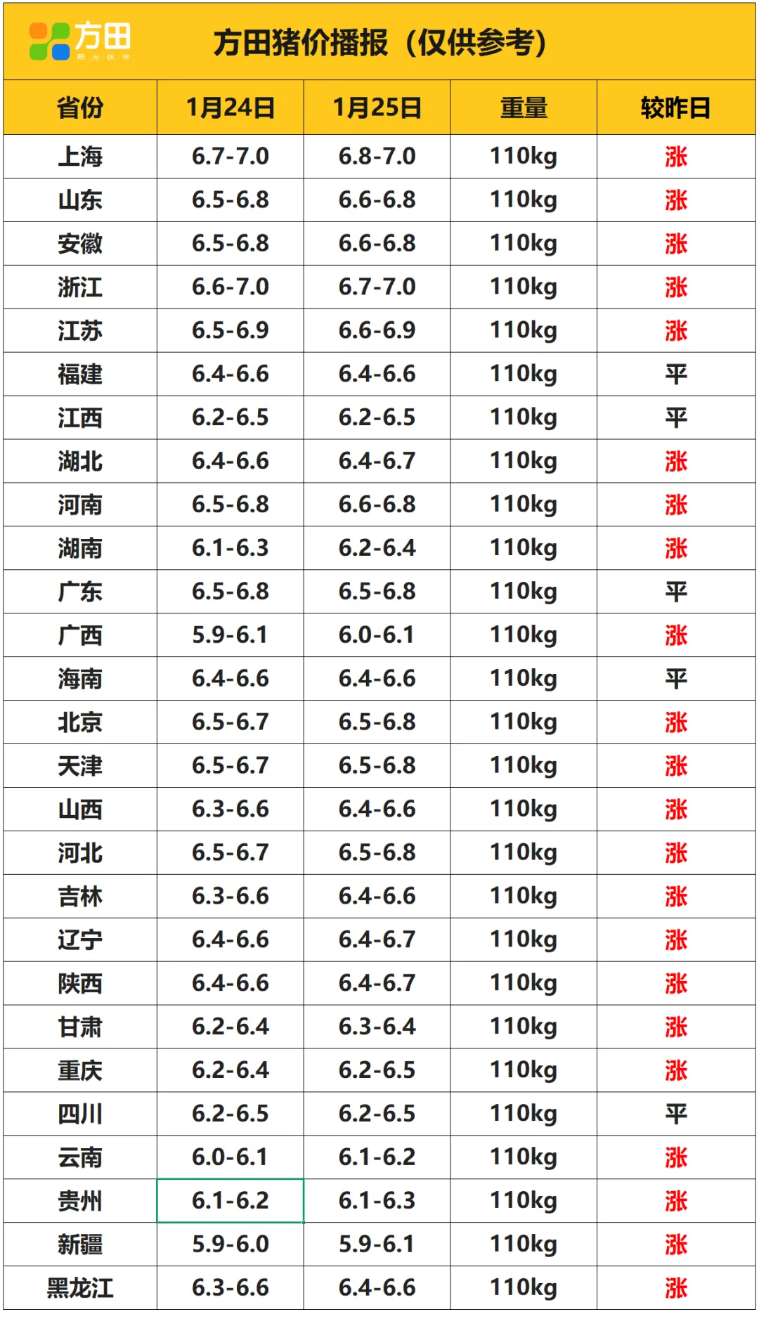 猪价丨1月25日 明日猪价早知道 养羊网 2026-01-24 猪价丨1月25日 明日猪价早知道 养羊网 2026-01-24 上一篇:(最新猪价)2026.01.25 下一篇:【明日猪价】涨!一片红! 您可能还会对下面的文章感兴趣111: 相关文章 无数人催的云养羊“轻体验版”,今天开闸! 【10斤整半只宁夏滩羊】【438】【纯享版】 农村从事养殖业的九个风险因素 2025年4月13日全国各地生猪价格信息