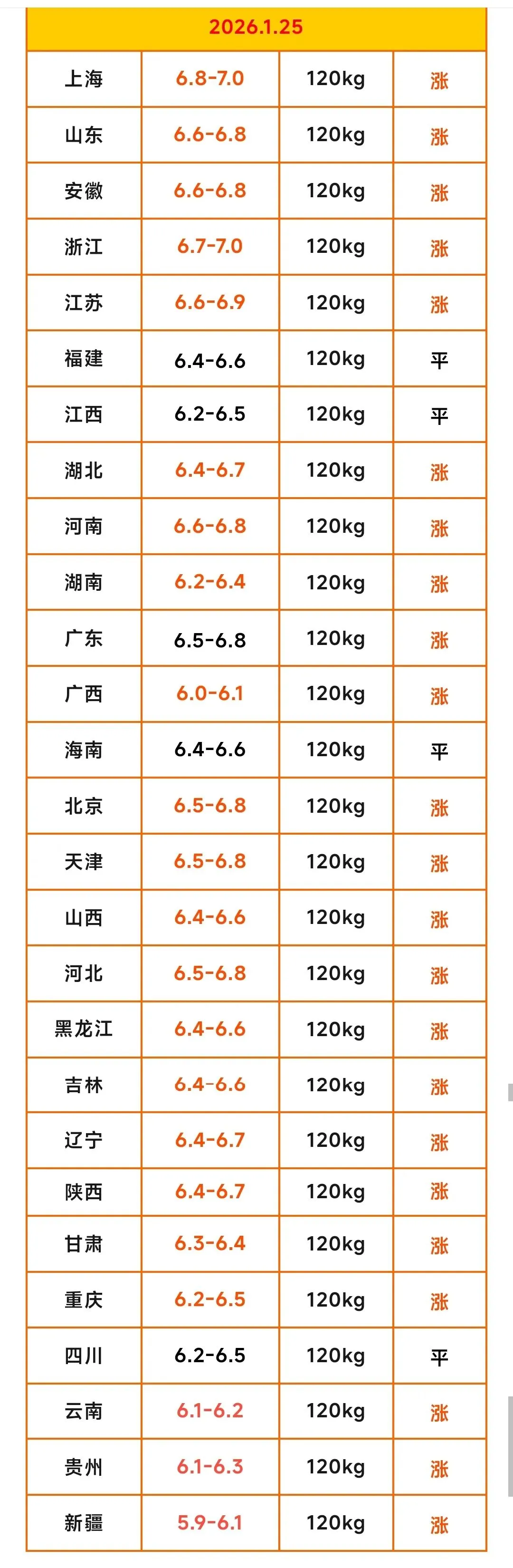 【明天猪价】1月25日最新猪价(火力全开,全面上涨)↑↑↑↑↑↑点击上方蓝字“养殖人家园”添加关注,每天给您最新、最准、最及时的猪价信息