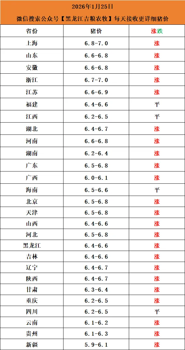 【黑龙江吉粮农牧】2026年1月25日猪价早知道点击上方"蓝字" 关注我们吧!