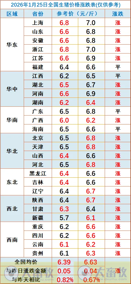 大畜牧根据27省的猪价数据,计算出2026年1月25日全国平均猪价为每斤6.51元,比昨天上涨0.05元,涨幅为0.75%,涨幅扩大,连续2天上涨,累计上涨0.07元,为近4天最高价。