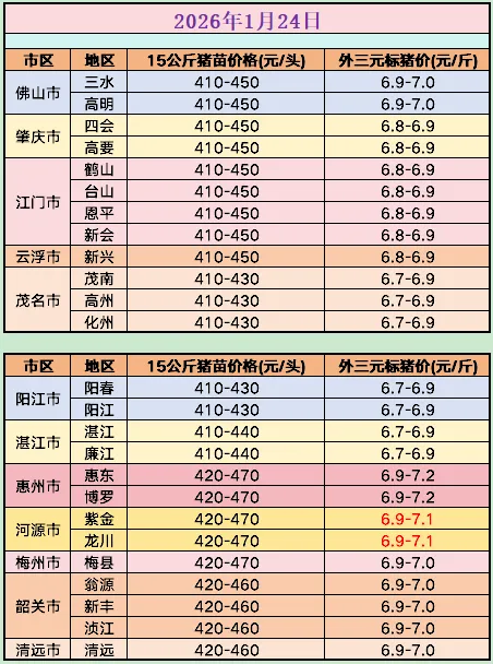 1月24日猪价速递 养羊网 2026-01-24 1月24日猪价速递广东猪苗全省各地报410~470元起,毛猪报6.7~7.1元,除河源升价外,其它地区价格稳定。年关行情已启动,节奏瞬息,踏准步伐。(行情仅供参考) 养羊网 2026-01-24 上一篇:暴涨26.01.25猪价 下一篇:明日猪价 | 2026.1.25日~全国各地最新猪价(猪价不负众望,全面飘红!) 您可能还会对下面的文章感兴趣111: 相关文章 近期价格更新!!! 2025年4月13日全国各地生猪价格信息 2025年4月13日全国各地生猪价格信息 鸡蛋出场价格稳中偏强运行 淘汰鸡出场价稳中小幅震荡