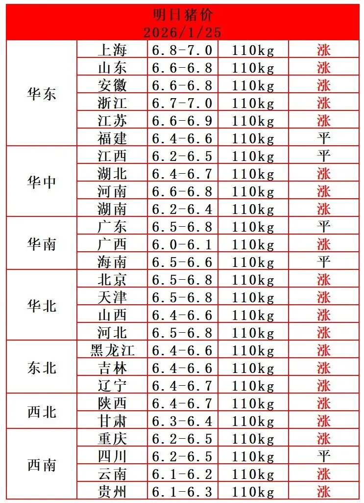 【明日猪价】1月25日 猪价涨了,南北猪价齐涨! 养羊网 2026-01-25 【明日猪价】1月25日 猪价涨了,南北猪价齐涨!#猪价 养羊网 2026-01-25 上一篇:【明天猪价】1月25日全国猪价(已更新!) 下一篇:今日猪价| 2026.1.24.全国最新猪价信息(已更新) 您可能还会对下面的文章感兴趣111: 相关文章 生猪的第一搏击点 5.25猪价预预警北方哀鸿遍野南方逆势飘红 养羊人 近期价格更新!!!