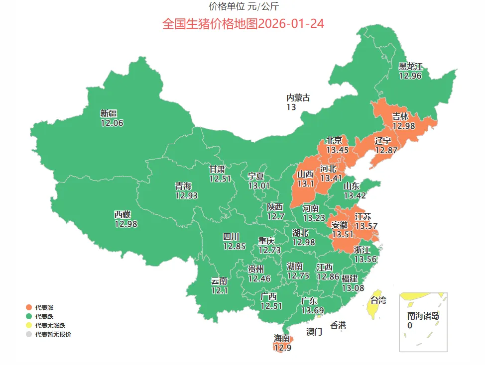 2026年1月24日,全国生猪价格整体呈现普涨态势,仅海南、福建、江西、四川4个省份价格持平,其余省份猪价均出现不同程度上涨,无省份价格下跌。