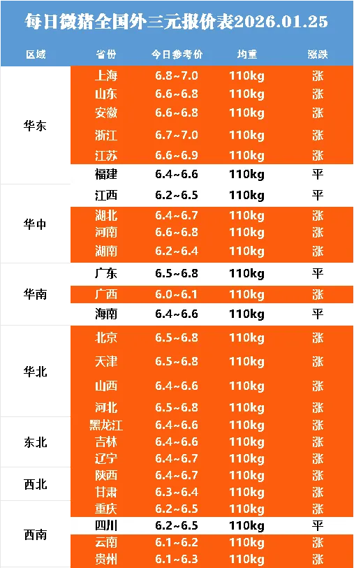 明日最新猪价2026.01.25——大面积上涨!点击蓝字关注 猪价不错过