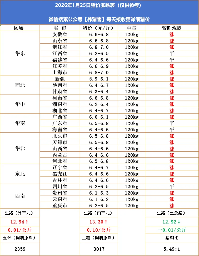 养猪客|2026.1.25|明天猪价分析(只供参考) 养羊网 2026-01-25 养猪客|2026.1.25|明天猪价分析(只供参考) 养羊网 2026-01-25 上一篇:【超前猪价大预测】1月26~1月28日!全国猪价 下一篇:2026年1月25日最新鸡蛋价格 您可能还会对下面的文章感兴趣111: 相关文章 近期价格更新!!! 2025年4月13日全国各地生猪价格信息 近期价格更新!!! 狼哥明日(1.20)鸡蛋价格预测,文末有豆粕下午报价