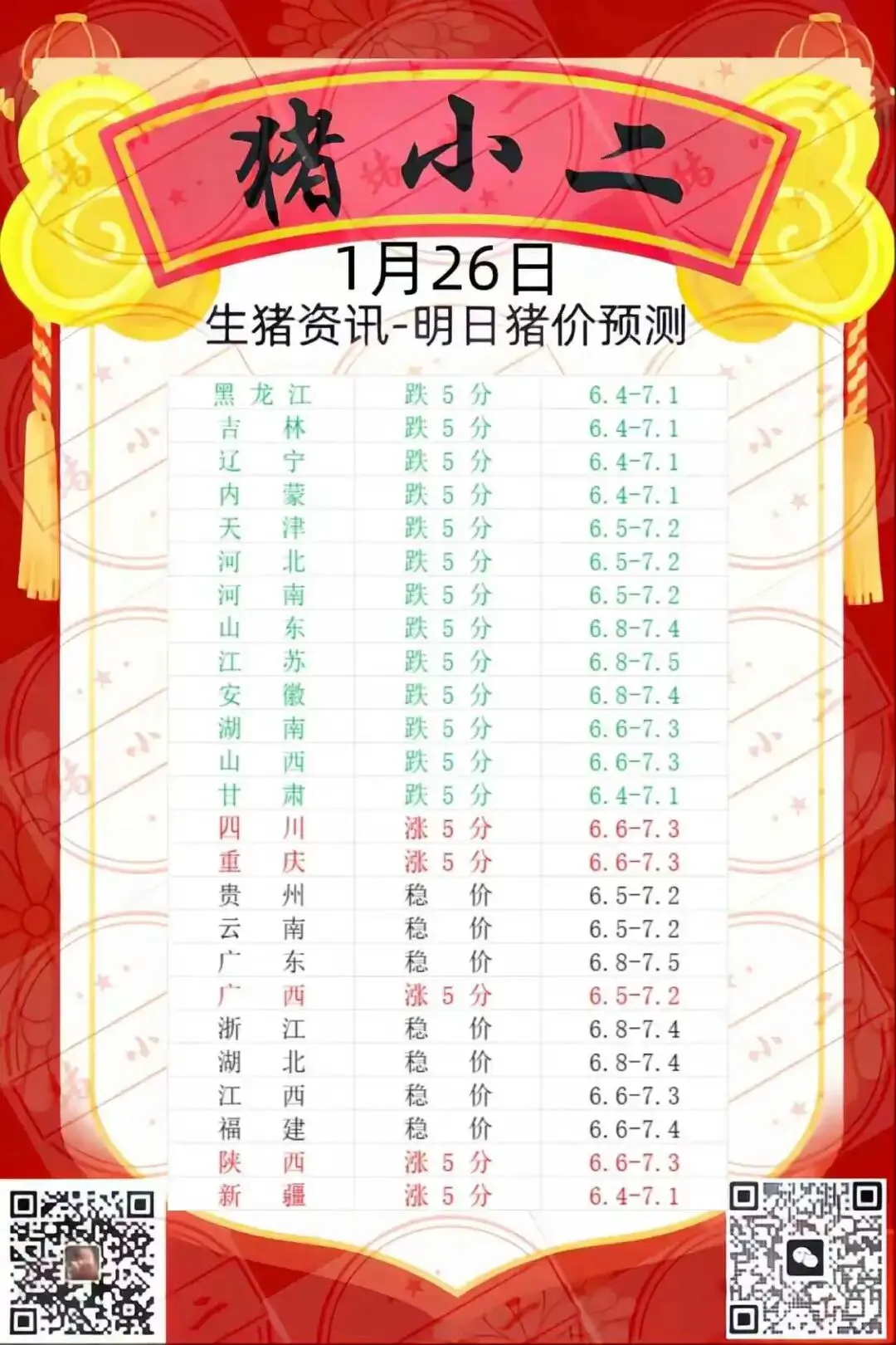 【猪小二】1.26日全国猪价预测:涨跌调整,稳定为主,局部偏弱 养羊网 2026-01-25 【猪小二】1.26日全国猪价预测:涨跌调整,稳定为主,局部偏弱 养羊网 2026-01-25 上一篇:猪价通知!明日猪价再次下跌!2026.01.26-明日猪价 下一篇:养羊哪些是选择做疫苗? 您可能还会对下面的文章感兴趣111: 相关文章 在永川 帮家里卖卖牛肉 近期价格更新!!! 近期价格更新!!! 〖鸡蛋价格早报〗2026年1月18日