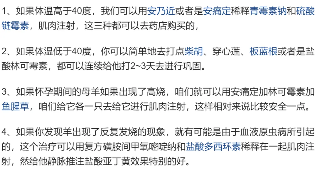 正常羊的体温是38度5到39度5之间,如果过高的话,咱们可以给他用点退烧药,就比如像安乃近啦,安痛定啦,板蓝根,柴胡都可以,如果体温过低的,咱们得给他配合好升温的药物,就是一侧给他打樟脑磺酸钠,另一侧配合打维生素C,,去给他进行很好的升温就可以了。