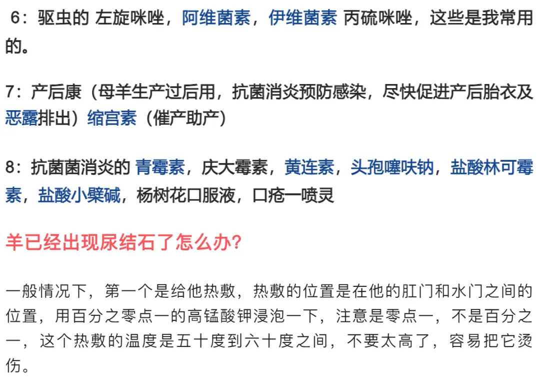 如果严重一点,要用药治疗的话,一般是一侧给他打头孢加鱼腥草,另外一侧加阿托品和地塞米松,早晚各一次,如果是小羊就减半,等他开始滴尿了,就再补上一针呋塞米。基本上就可以了。