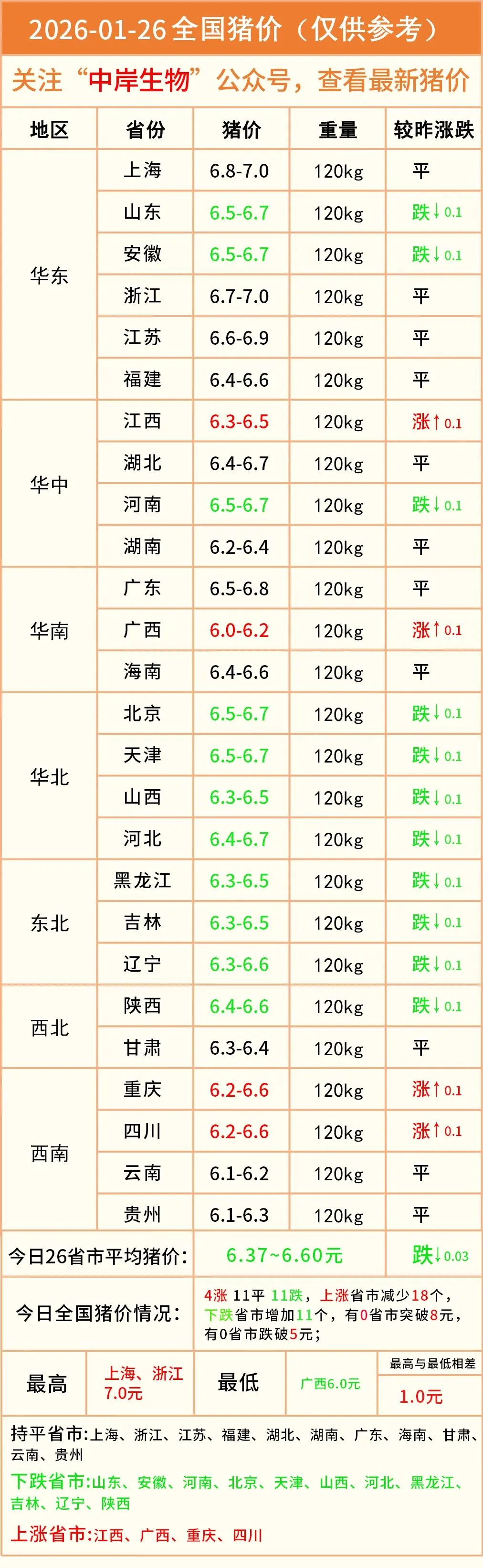 明日猪价|2026-01-26全国最新猪价(猪价已更新!) 养羊网 2026-01-25 明日猪价|2026-01-26全国最新猪价(猪价已更新!)营销中心丨0731-83806009技术服务丨0731-83806019 养羊网 2026-01-25 上一篇:明日猪价——2026年1月26日全国生猪价格! 下一篇:2026年1月26号鸡蛋价格:漫天飞舞,步步为赢. 您可能还会对下面的文章感兴趣111: 相关文章 第39篇:什么是【猪周期】? 多多五折鸡蛋来拼团 临安农家土鸡蛋?营养价值丰富 2025年4月13日全国各地生猪价格信息