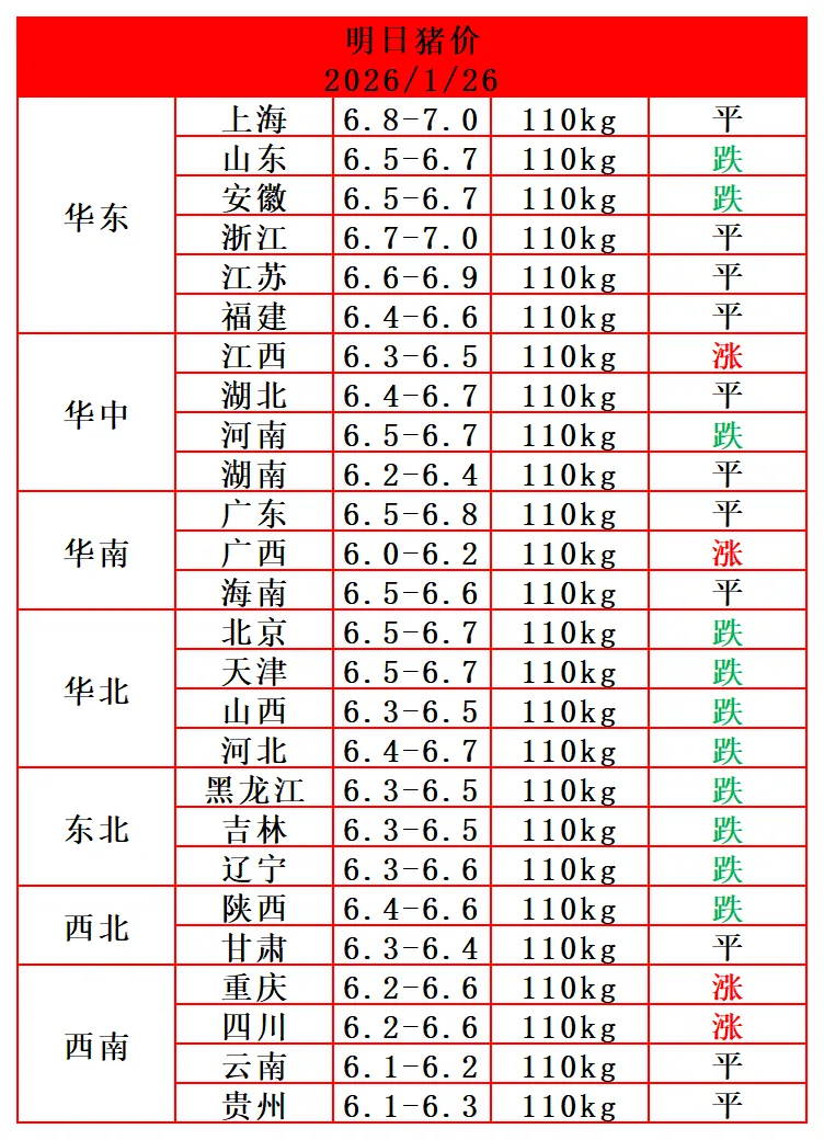 注:绿色表比前一天价格低↓,红色表示比前一天价格高↑,黑色的则表示不变。以上数据来源于最新猪报价,仅供参考。