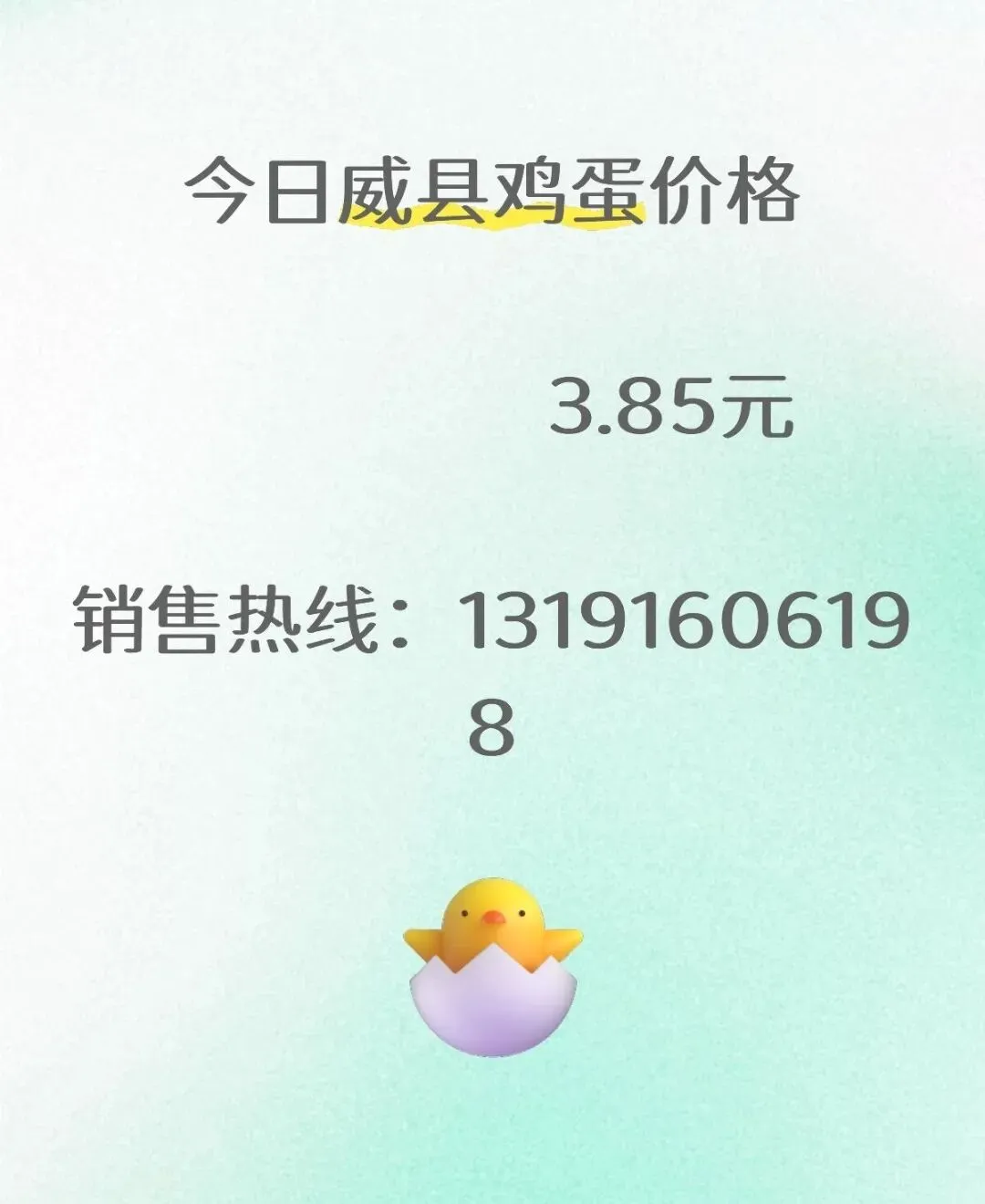 【2026.1.26】今日威县鸡蛋价格 养羊网 2026-01-26 【2026.1.26】今日威县鸡蛋价格 养羊网 2026-01-26 上一篇:今日鸡蛋价格(2026年1月26日平稳)蛋价未来10天预兆 下一篇:【养鸡课堂】行情早报—01月26日鸡蛋价格早报. 您可能还会对下面的文章感兴趣111: 相关文章 猪价行情好转,又要涨了?明日预计行情:6涨6平15跌!附1月23日最新全国生 1月21日全国最新鸡蛋价格:稳扎稳打,步步为营. 你们身边有没有什么奇能异士? 哪里有正宗土鸡蛋 求!!!我要买!