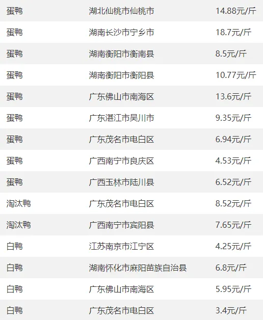 全国部分地区鸭的价格参考?