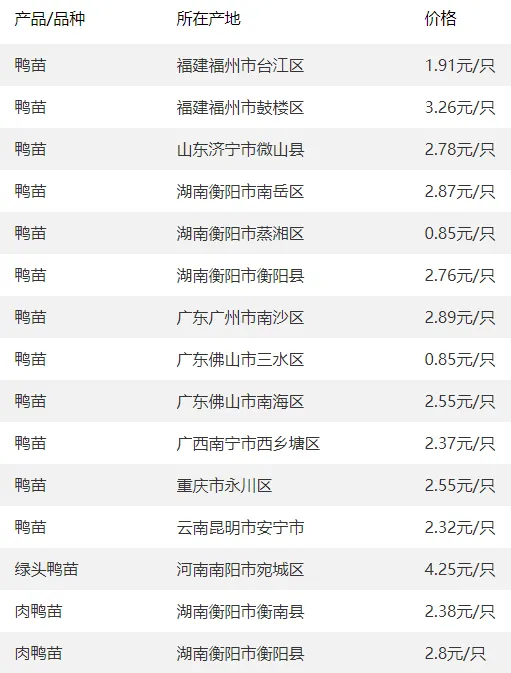 全国部分地区鸭苗价格参考