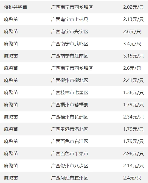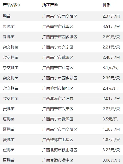 广西部分地区鸭苗价格参考