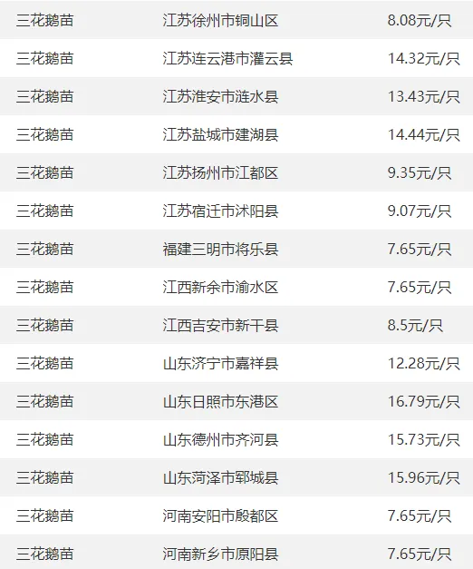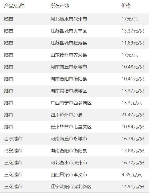 全国部分地区鹅苗价格参考