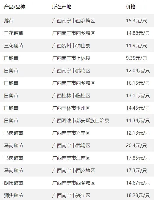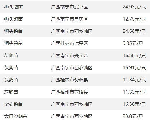 广西部分地区鹅苗价格参考