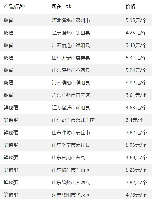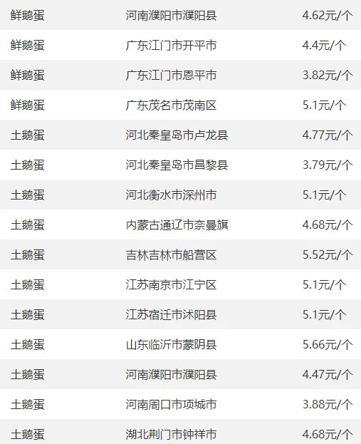 全国部分地区鹅蛋价格参考