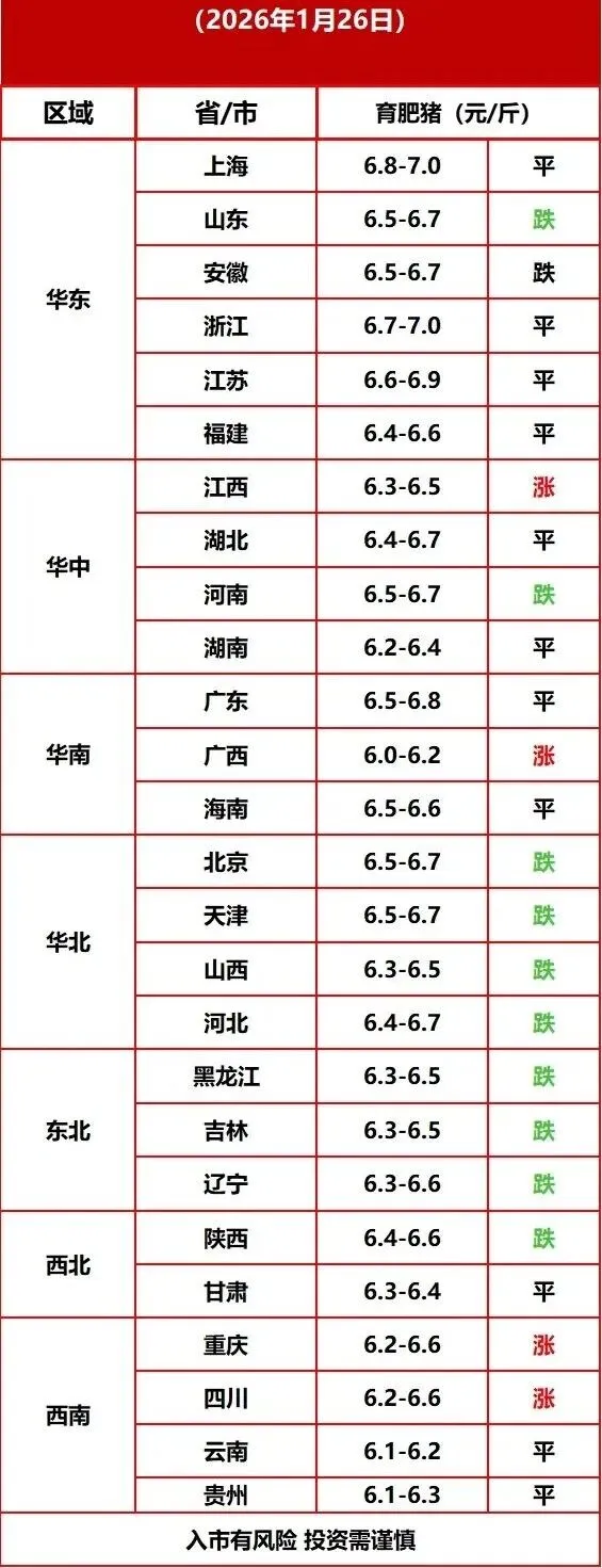 1月26日猪价上涨后下跌 承压下行 缺乏上涨空间 养羊网 2026-01-26 1月26日猪价上涨后下跌 承压下行 缺乏上涨空间每日猪价行情1月26日猪价上涨后下跌承压下行 缺乏上涨空间 已关注 关注 重播 分享 赞 视频详情 www.chinabreed.com中国养殖网 养羊网 2026-01-26 上一篇:全国各地明日猪价(2026.01.27)-山里香惠营 下一篇:【明日猪价】2026年1月27日全国各地猪价预测及分析 您可能还会对下面的文章感兴趣111: 相关文章 近期价格更新!!! 自家土鸡蛋,梅溪湖周边可送货 冷知识!原来鸡蛋可以这样白拿 八元的京东鸡蛋