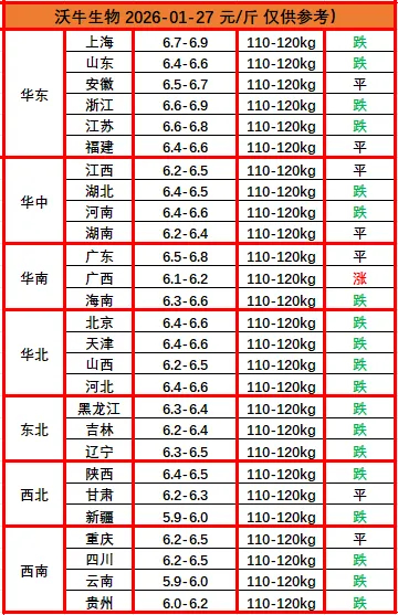 ? ?猪价播报沃小牛,助力养猪牛牛牛!各位养猪的老铁们,大家好!我是沃小牛,明天是2026年01月27日,最新猪价已经出来了:您出了吗?出到何种程度了?明天猪价跌面扩大,在本该持续上涨的季节里硬是走出了“反预期”的路线。眼下的猪价下跌是“供应的集中释放”撞上了“需求的温和增长”,是市场在磨底阶段的正常博弈。老铁们从“压栏盼涨”到“出栏避险”,前期猪价上涨,普遍存在惜售心理,等待更高的价格。但随着春节临近,节日消费的“窗口期”缩短,为了避免节后需求断崖式下跌的风险,养殖户出栏意愿变得积极,集中出栏的行为本身就会压制价格。