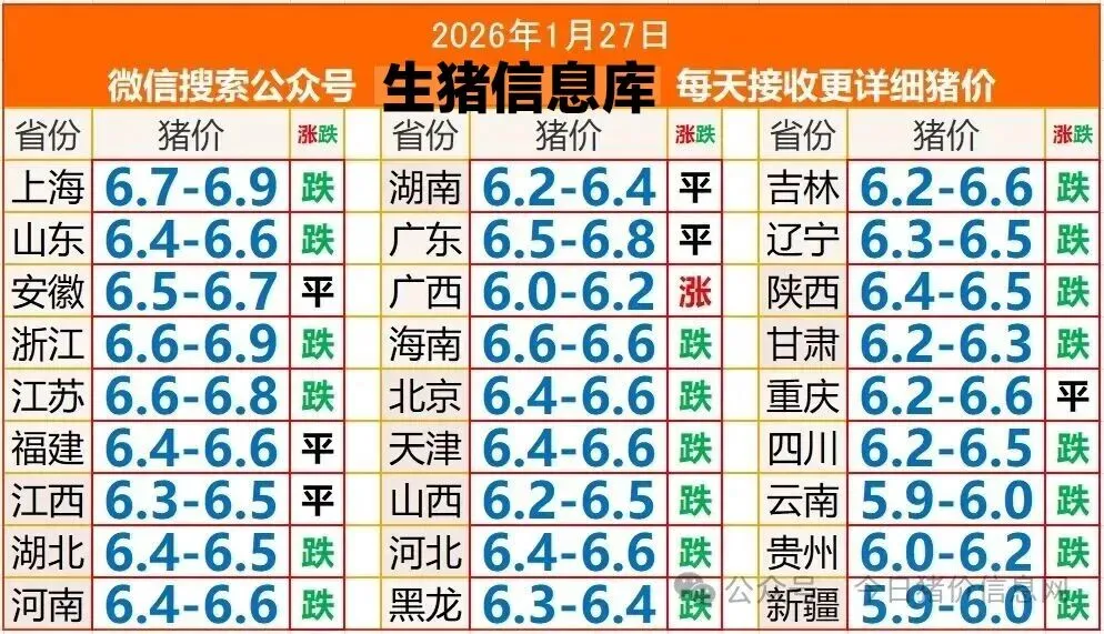 猪价下滑26.01.27 养羊网 2026-01-27 猪价下滑26.01.27 养羊网 2026-01-27 上一篇:猪价 | 2026.1.27~最新猪价 下一篇:猪价大预测】1月27日~1月29日全国猪价大预测! 您可能还会对下面的文章感兴趣111: 相关文章 11月5日全国外三元猪价 梧州市荷兰小香猪多少钱 天天薅O圆黑五鸡蛋 土鸡蛋 活动价:1块钱一个