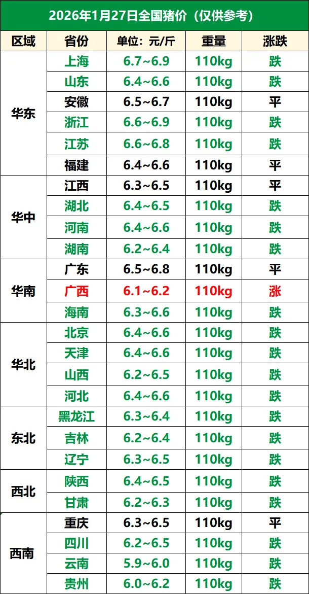 1月27日全国猪价一夜降温,下跌“势如破竹”! 养羊网 2026-01-27 1月27日全国猪价一夜降温,下跌“势如破竹”! 养羊网 2026-01-27 上一篇:2026.01.27-今日猪价 下一篇:2026.1.27猪价快讯--福州穗丰动保 您可能还会对下面的文章感兴趣111: 相关文章 说真的,25年的风口已经很明显了... 2026年1月25日全国生猪行情汇总:猪价一度反弹至13元/kg,北方显现较强看涨预期,小年前 出big壮硕猪和偷感很重猪 野生金银花66一斤你会买吗?
