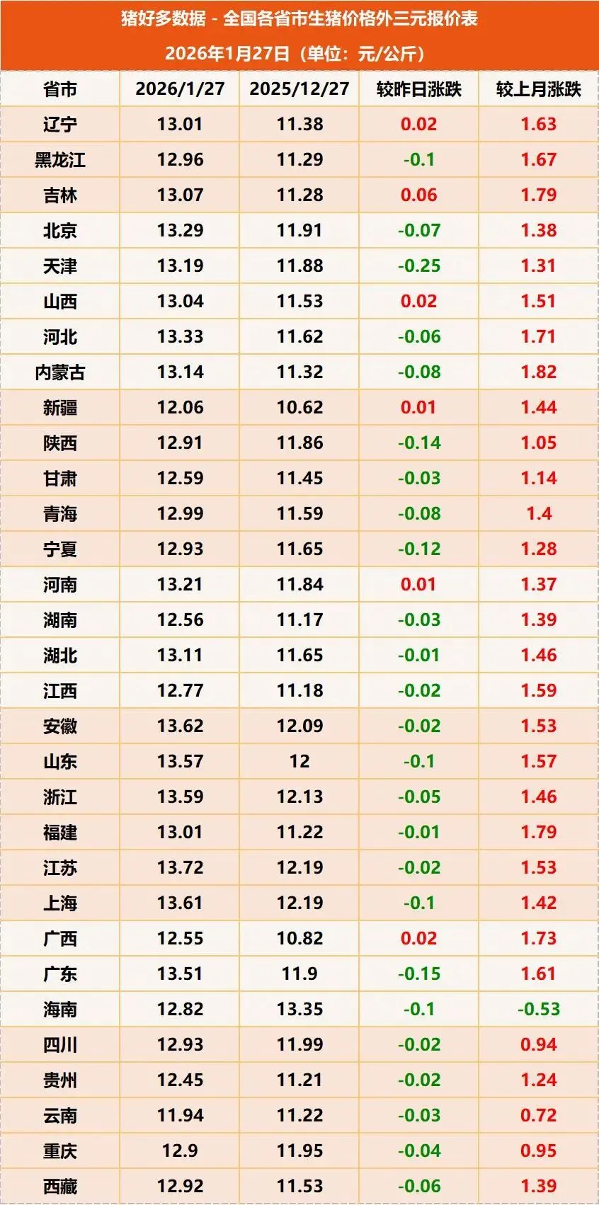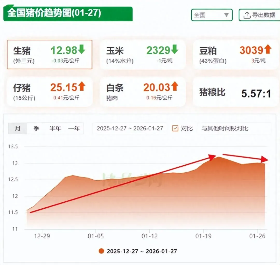 随着春节脚步越来越近,市场供需博弈进入关键期,体现在猪价走势上,1月下旬以来,猪价开始频繁涨跌!据猪好多数据监测显示,2026年1月27日全国外三元生猪均价为12.98元/公斤,较昨日下跌0.03元/公斤,较上周二(1月20日)下跌0.13元/公斤,周内猪价整体呈现出3涨4跌的震荡格局,且猪价重心出现下移风险。