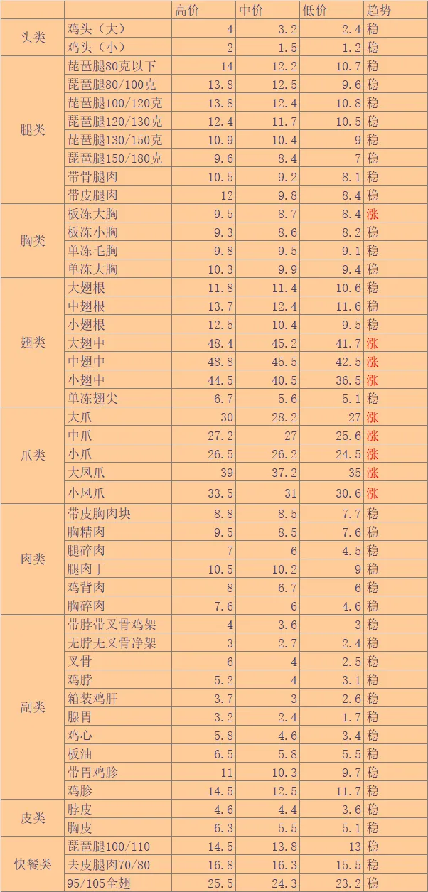 10.今日全国主流价格多数继续上涨,今日东北辽宁价格上涨、吉林价格上涨,黑龙江蛋价上涨,山西价格以涨为主、河北价格以涨为主;山东主流价格多数上涨,河南蛋价格上涨,湖北褐蛋价格涨、江苏、安徽价格以涨为主,局部鸡蛋价格有高低,蛋价继续震荡盘整 ,走货正常。
