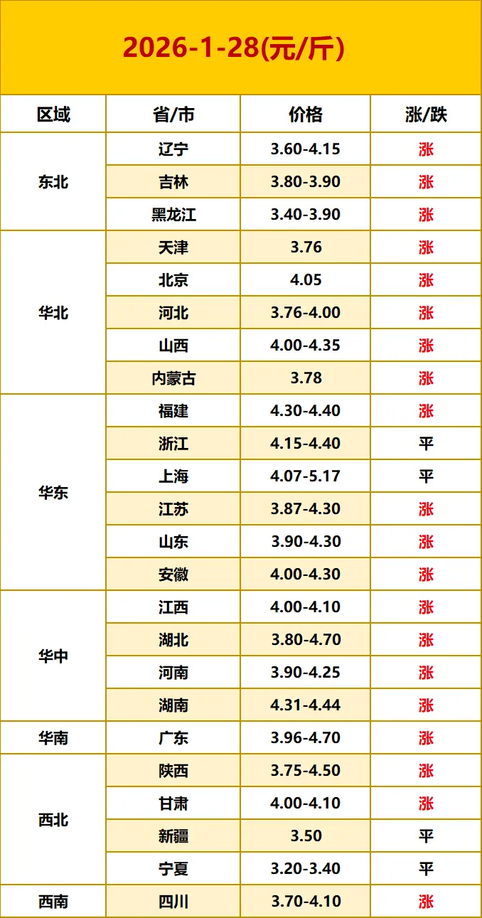 2026.1.28 今日鸡蛋价格 养羊网 2026-01-28 2026.1.28 今日鸡蛋价格蛋价日评:今日鸡蛋价格上涨。产蛋鸡存栏量小幅下降,库存处于偏低水平,养殖户挺价惜售,叠加前期北方物流影响,局部供应偏紧;春节节前备货需求仍在,北方务工返乡进一步拉动消费需求。短期来看,蛋价继续上行支撑有限,预计近期蛋价窄幅震荡调整。以上报价仅供参考! 养羊网 2026-01-28 上一篇:明日猪价 | 2026.1.28 行情持续盘整 下一篇:猪价有变!2026.1.28全国各地生猪价格早知道! 您可能还会对下面的文章感兴趣111: 相关文章 近期价格更新!!! 养羊妹 白银也跟着大涨?? 近期价格更新!!!