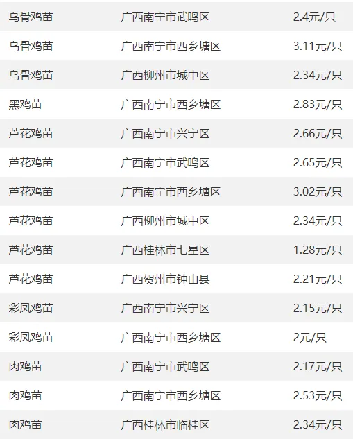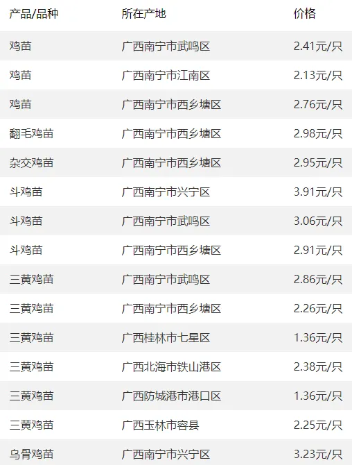 广西部分地区鸡苗价格