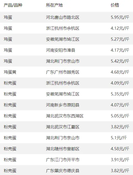 全国部分地区鸡蛋价格