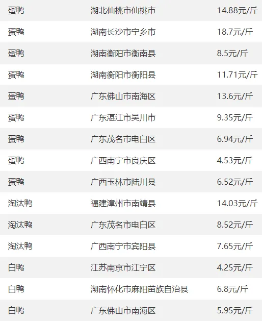 全国部分地区鸭的价格参考?