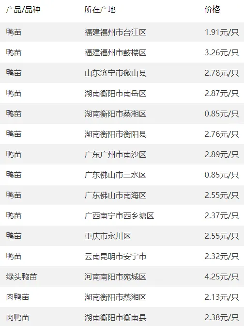 全国部分地区鸭苗价格参考