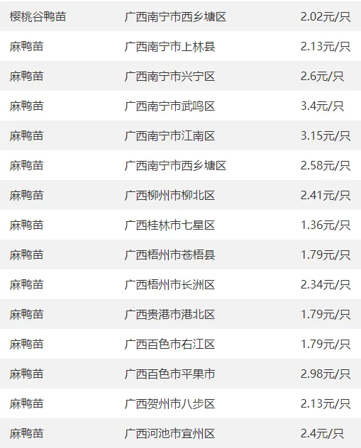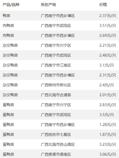 广西部分地区鸭苗价格参考