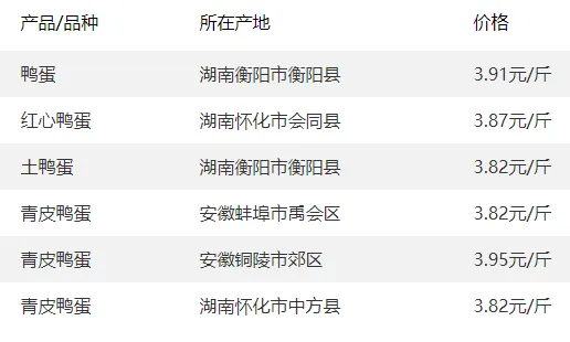 全国部分地区鸭蛋价格参考